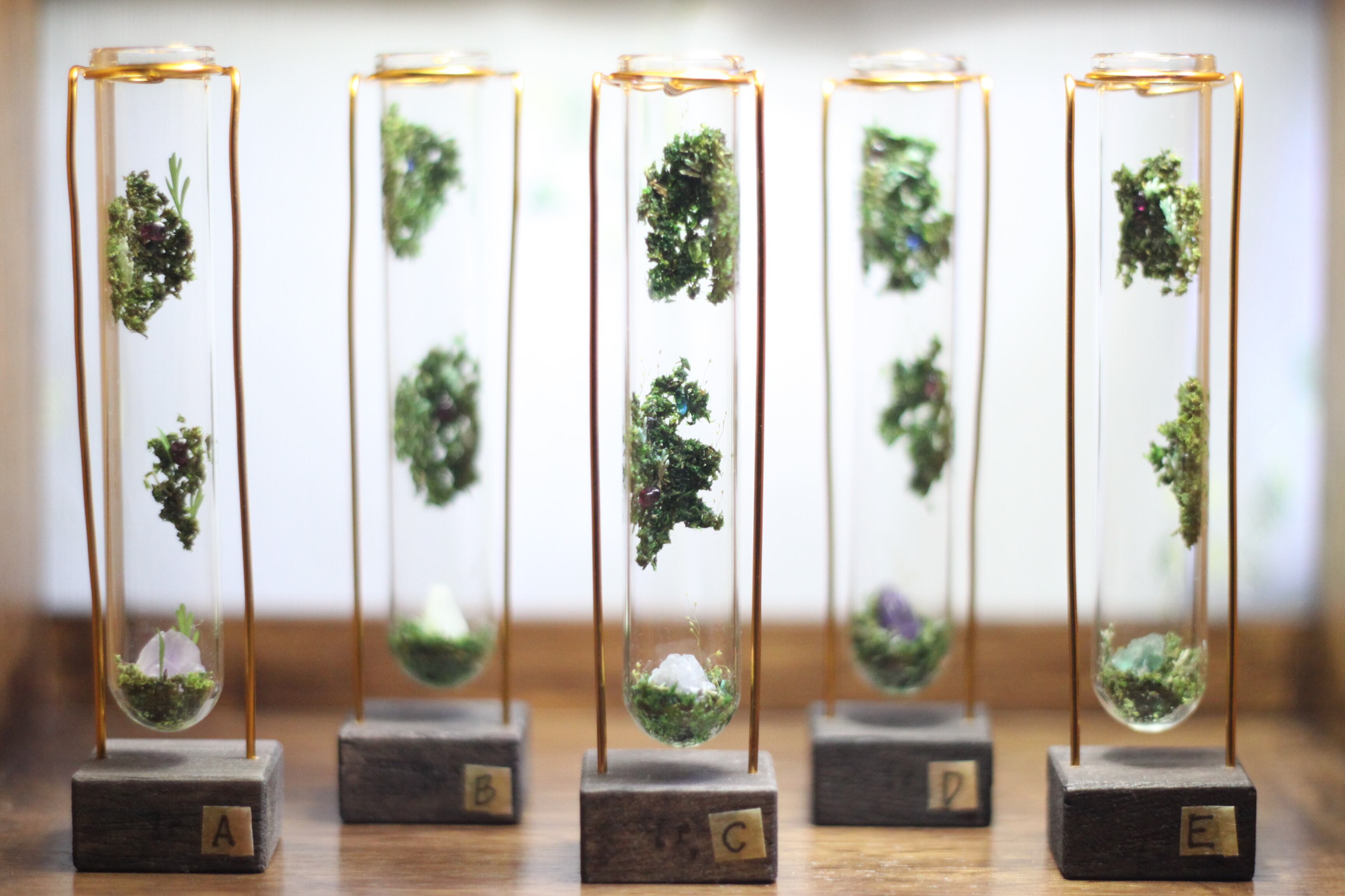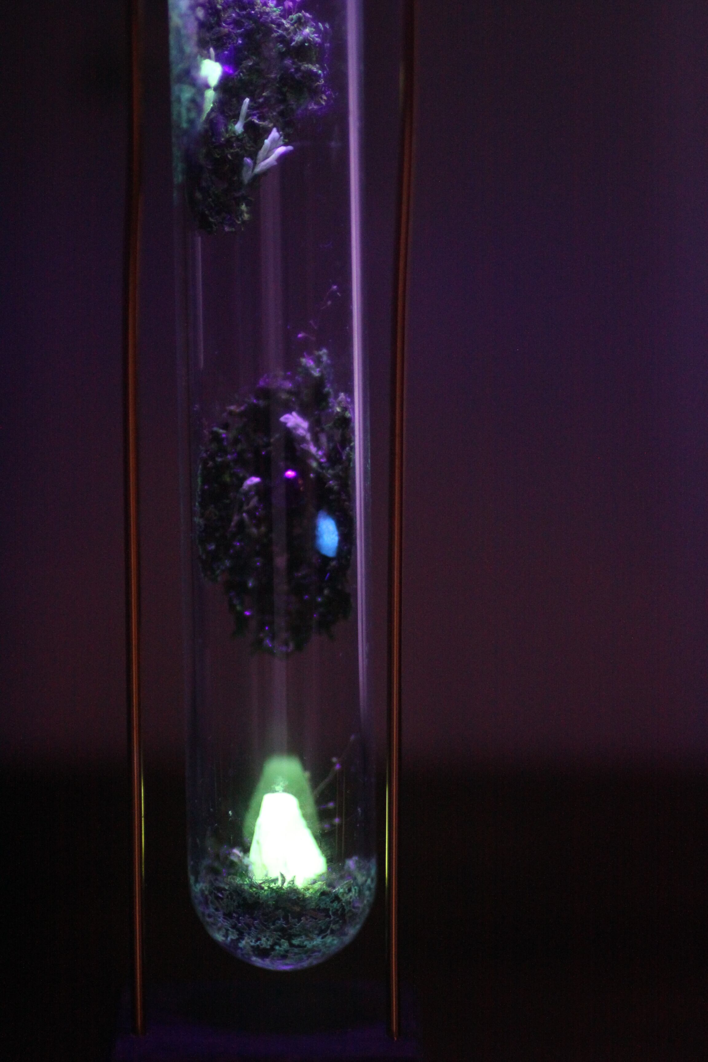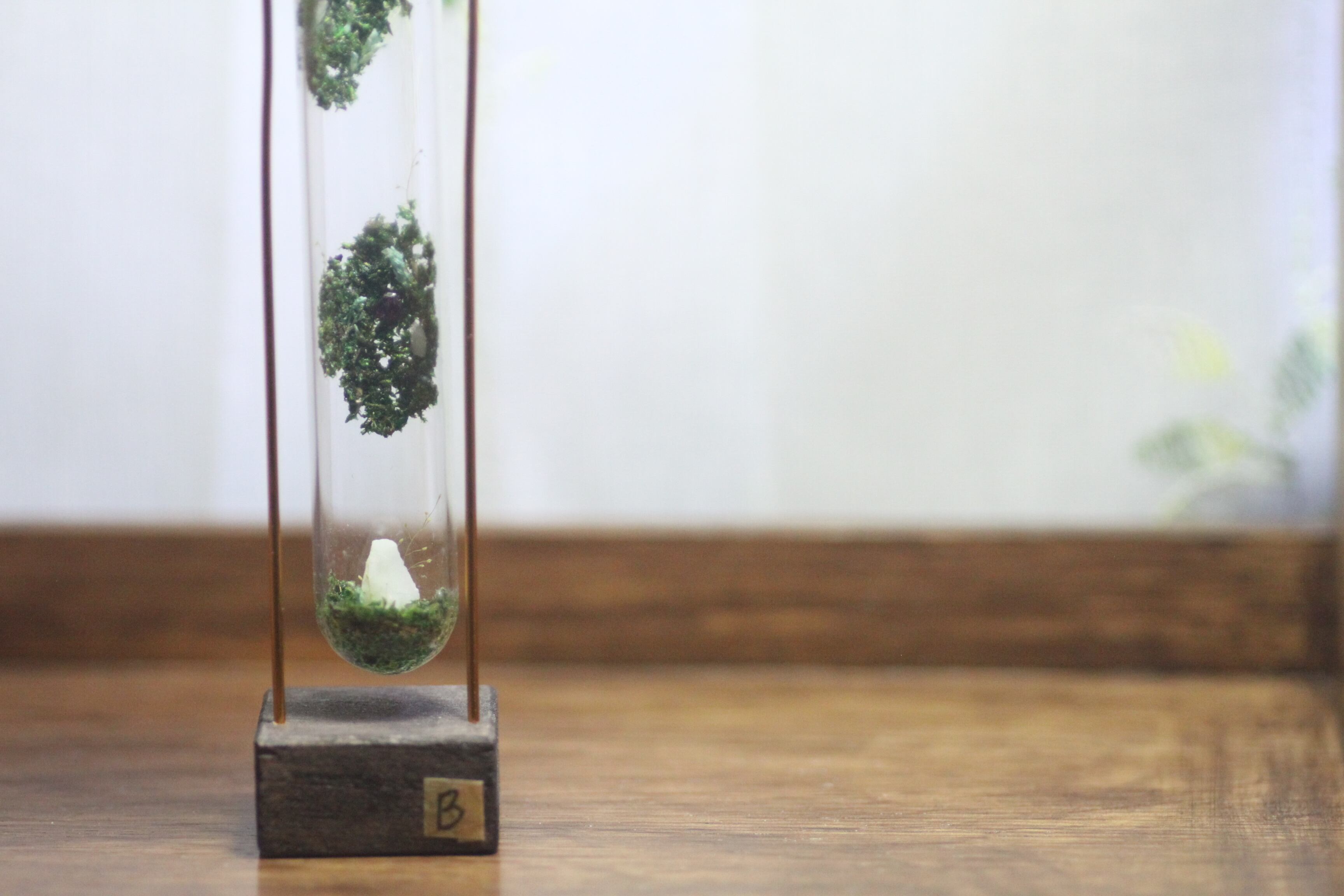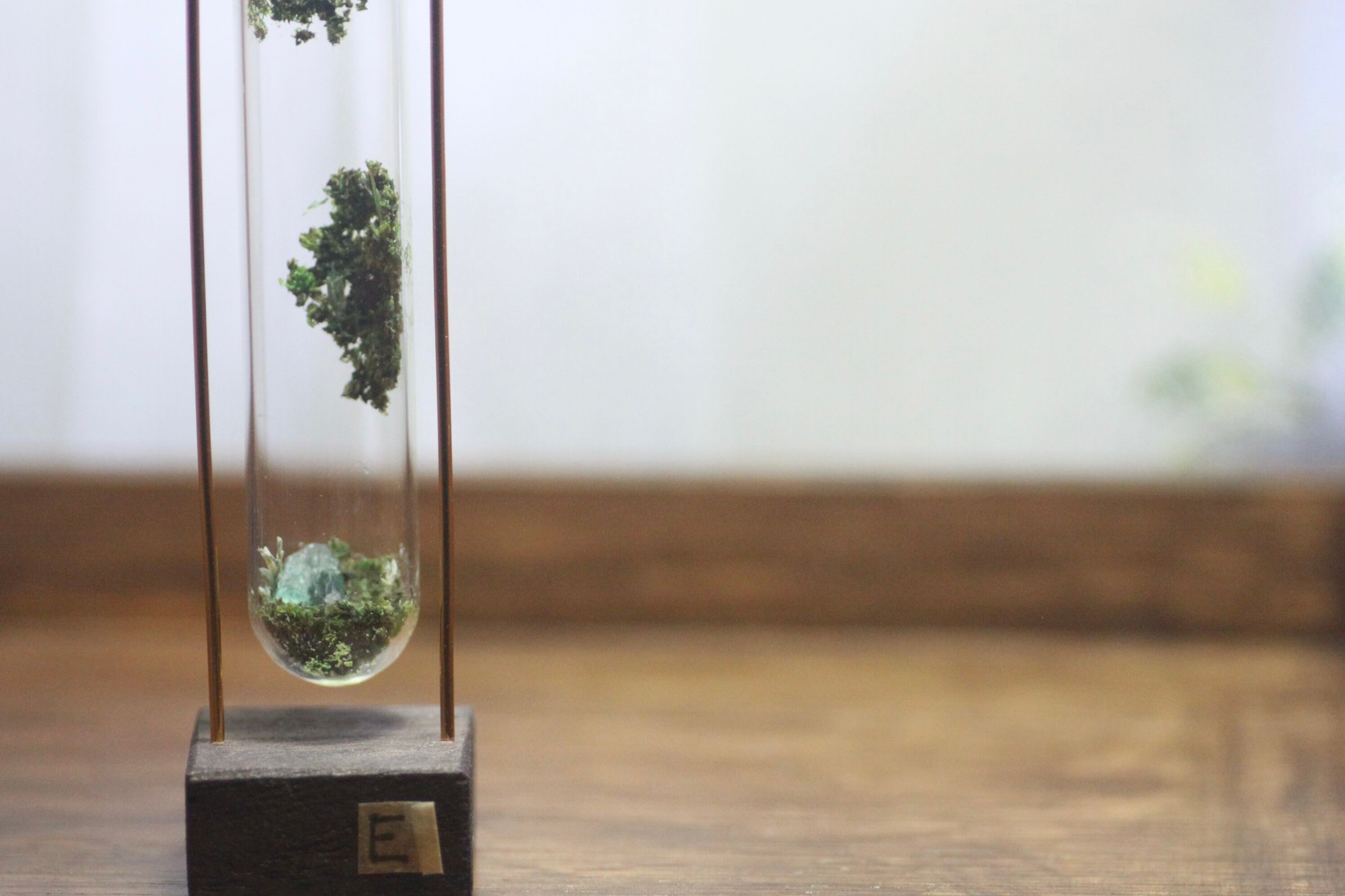 試験管の壁面に張り付く苔の中には、小さな鉱石たちがいるようです。