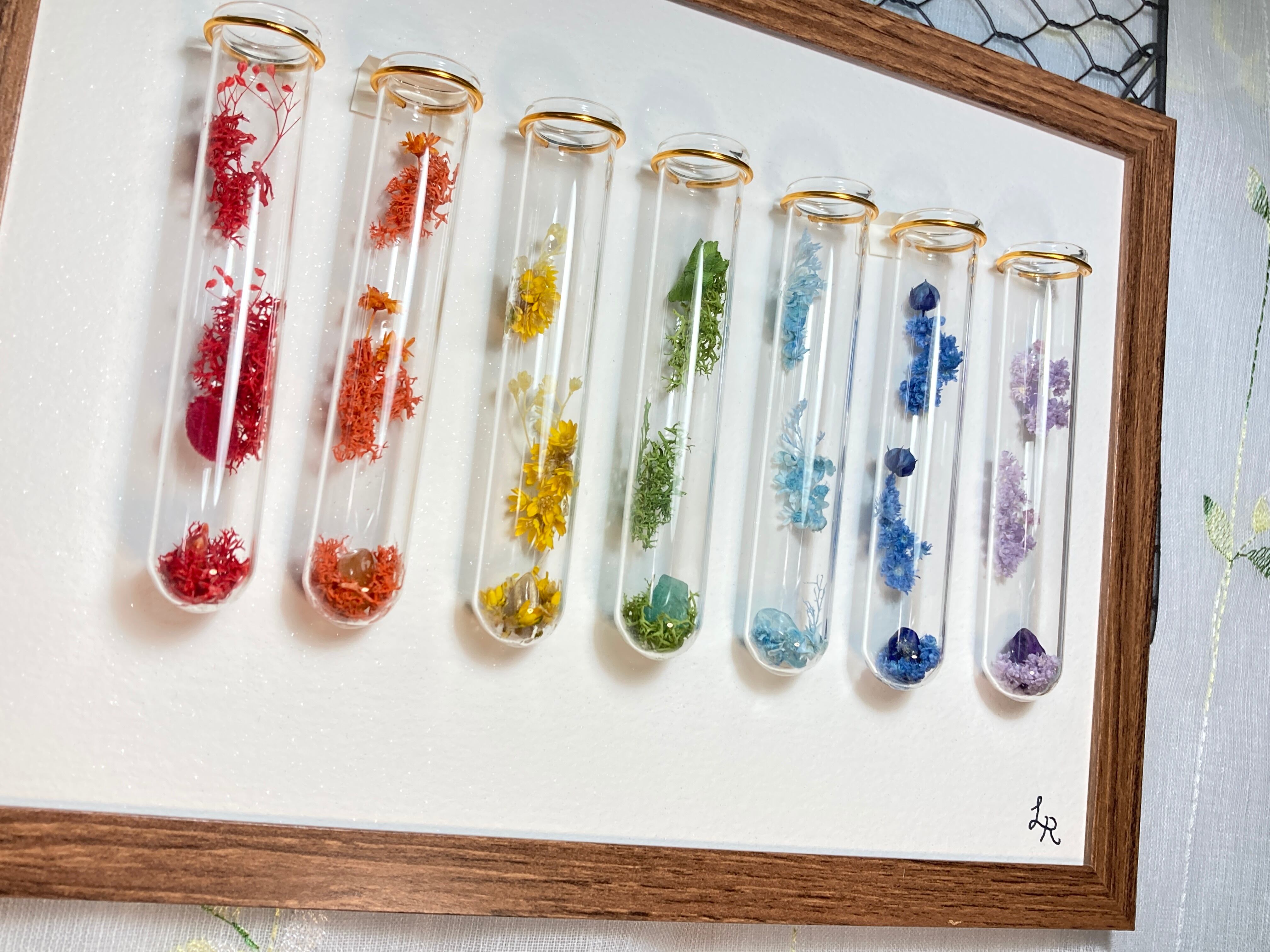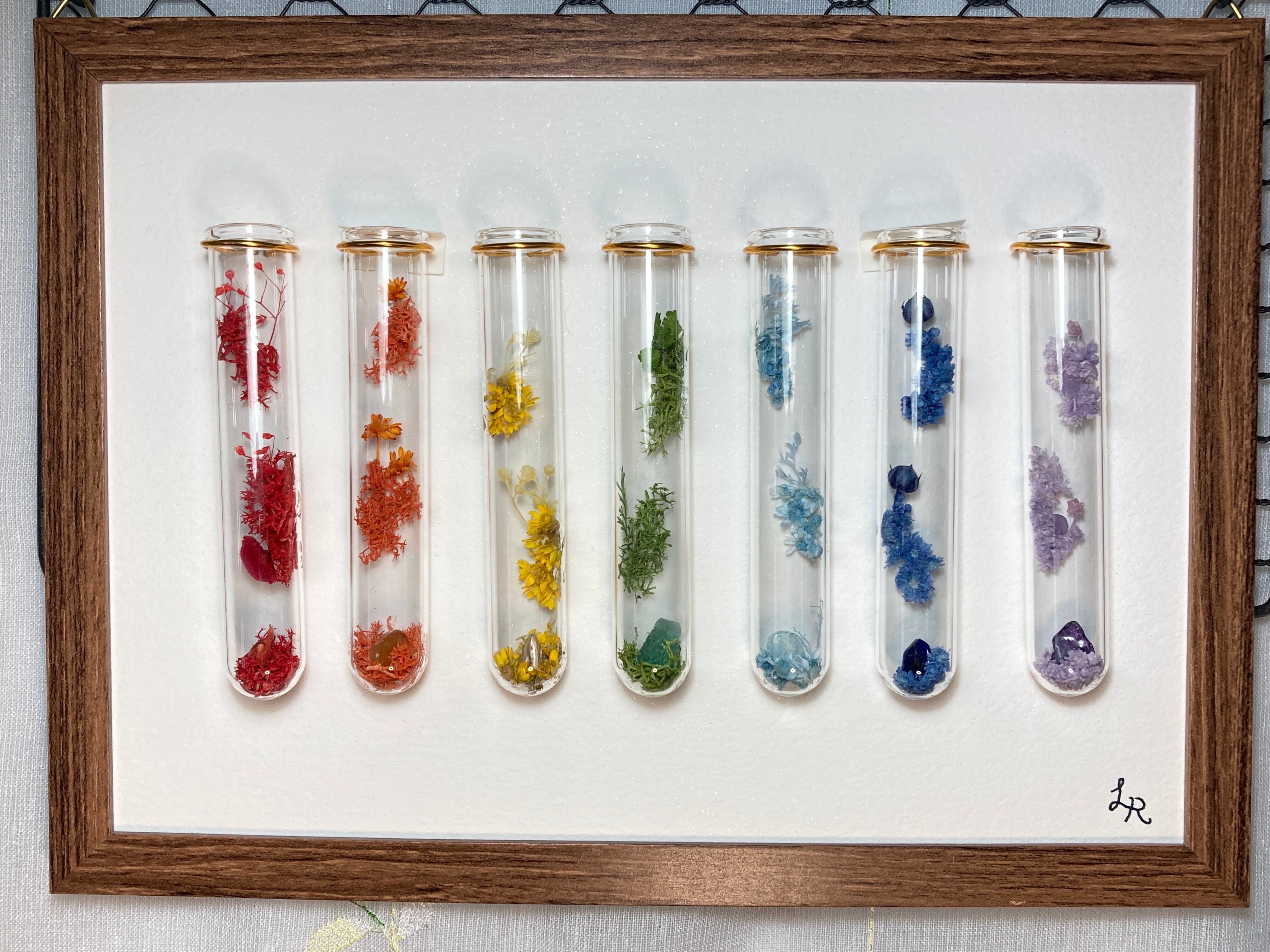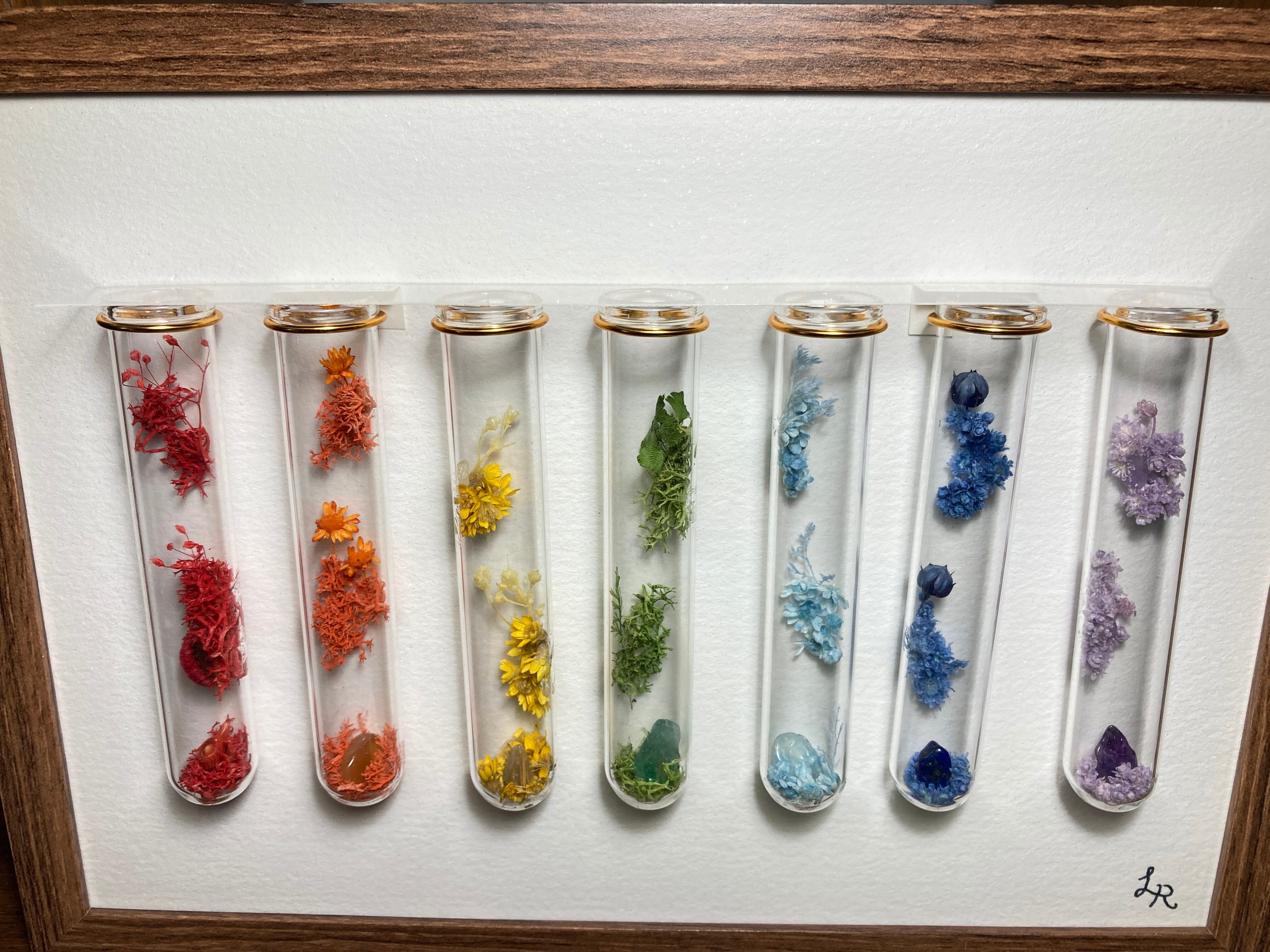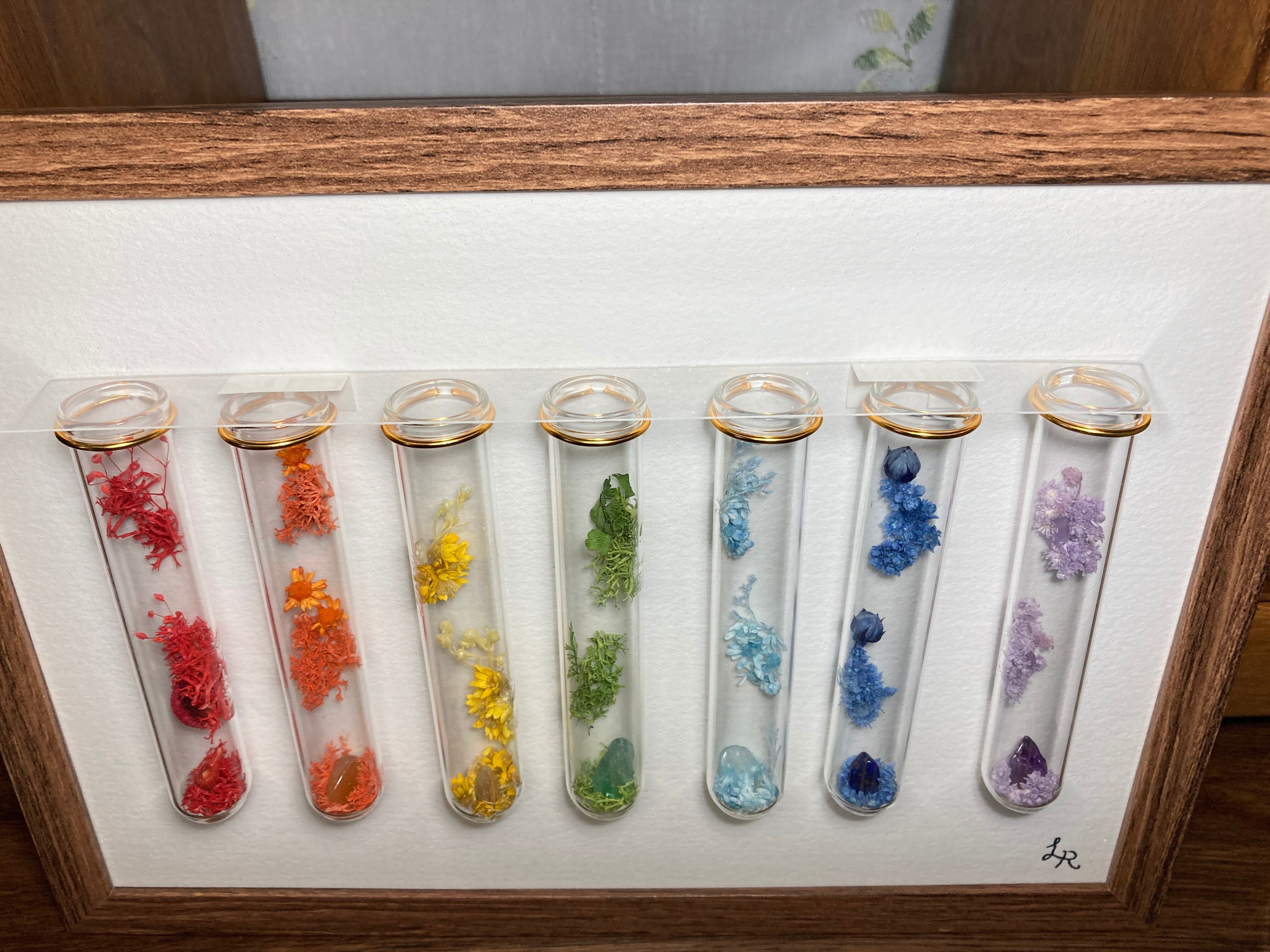 虹色の赤、橙、黄色、緑、青、紺、紫を参考に、赤、橙、黄色、緑、水色、青、紫の試験管Colorsを額縁に飾りました。