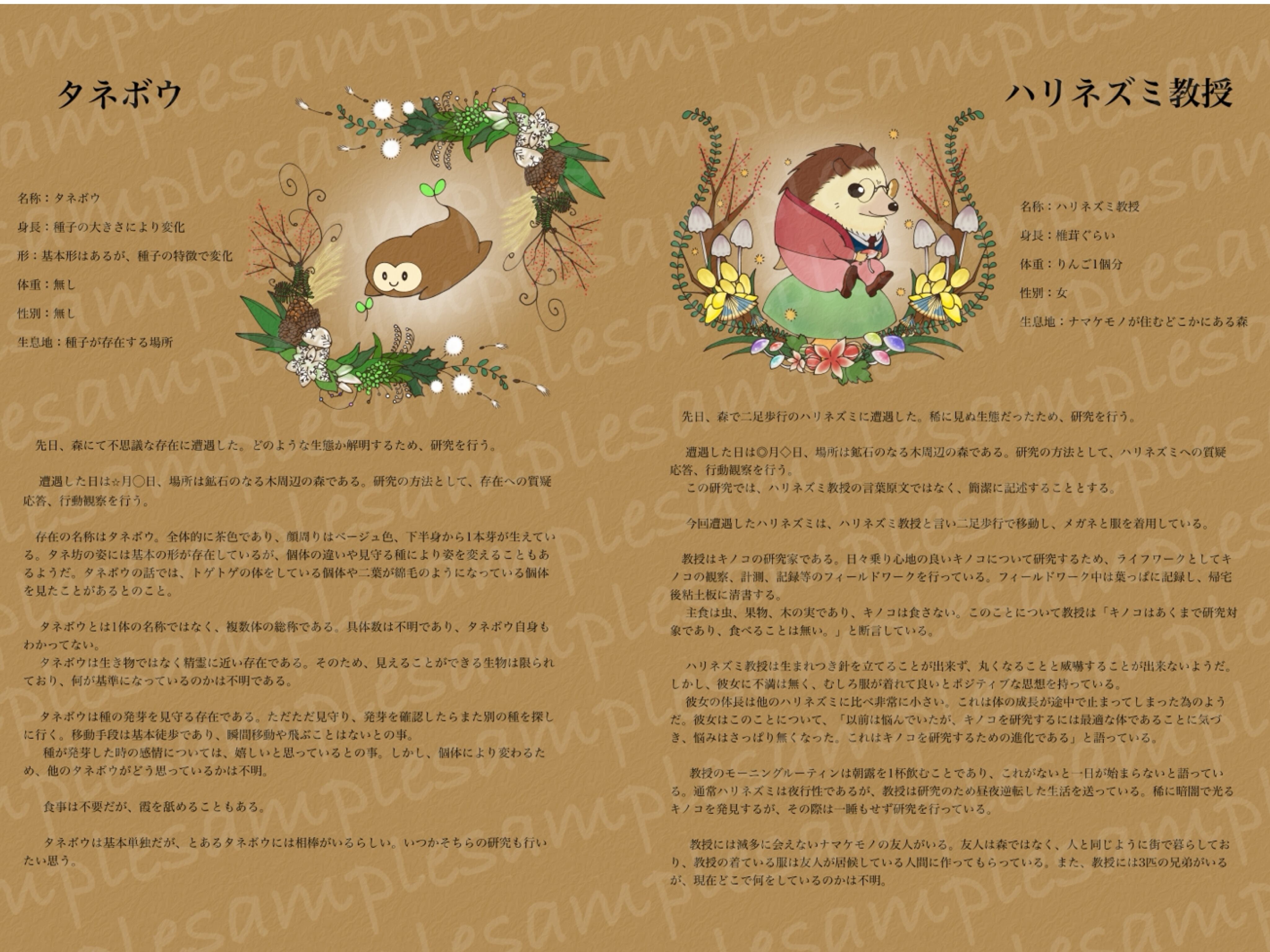 針のしんさんのハリネズミ教授とたね坊主さんのタネボウ、2匹の生態を書いたクリアファイルです。