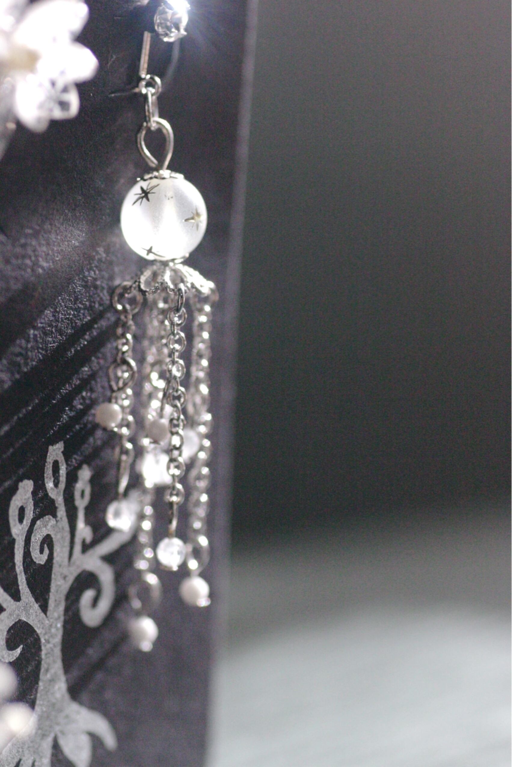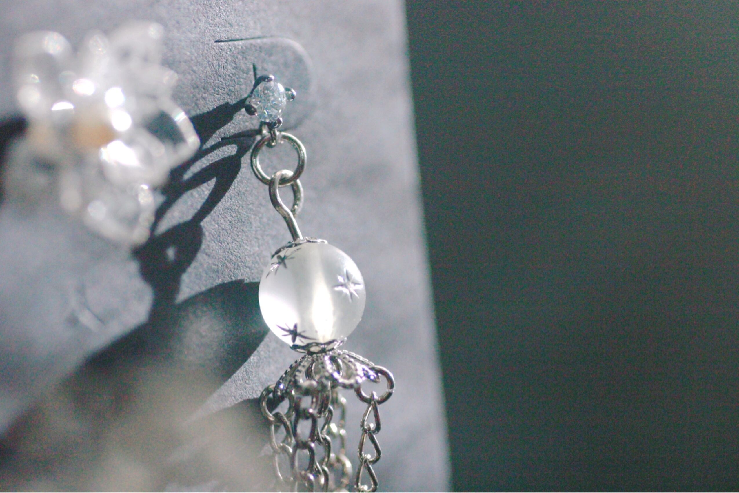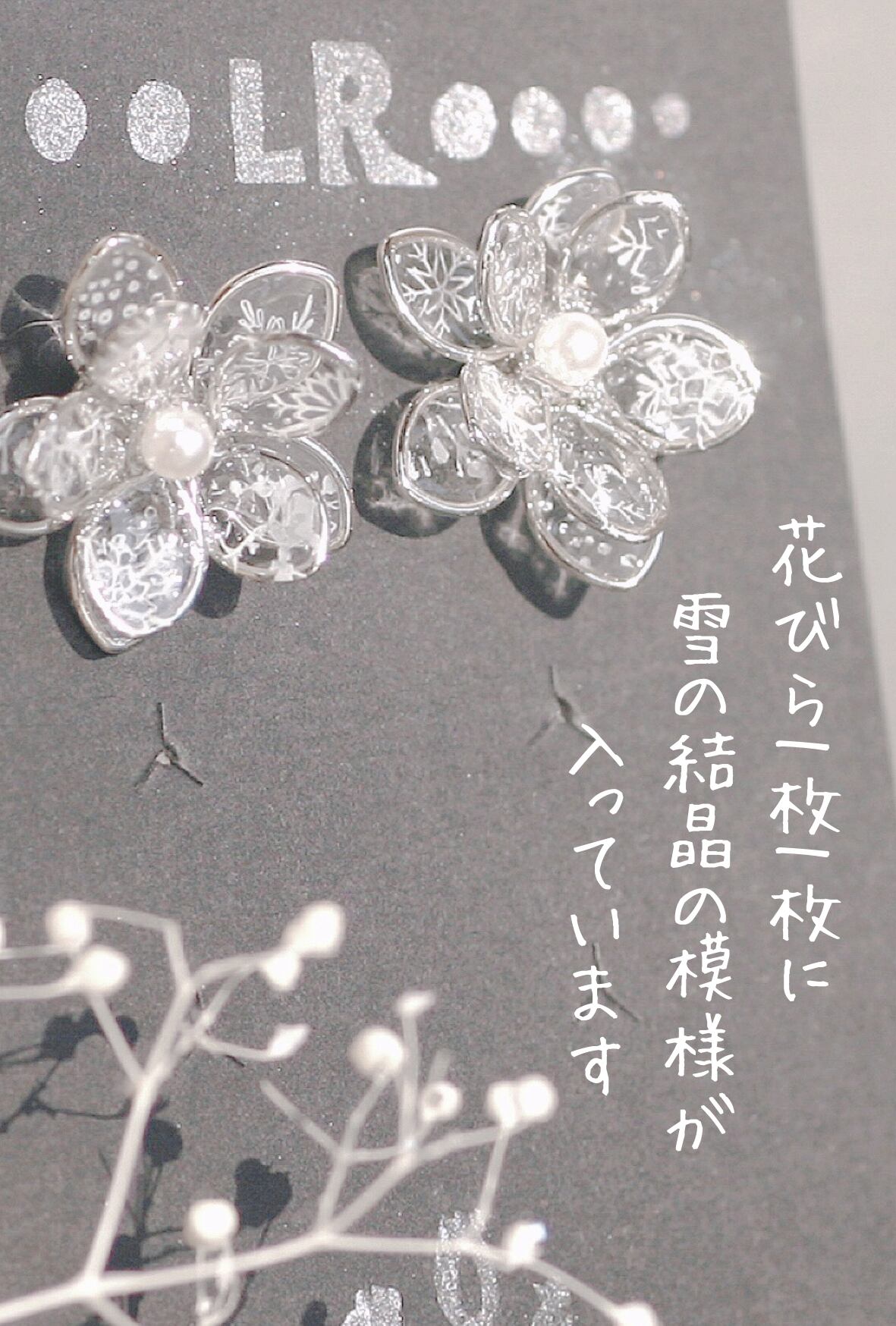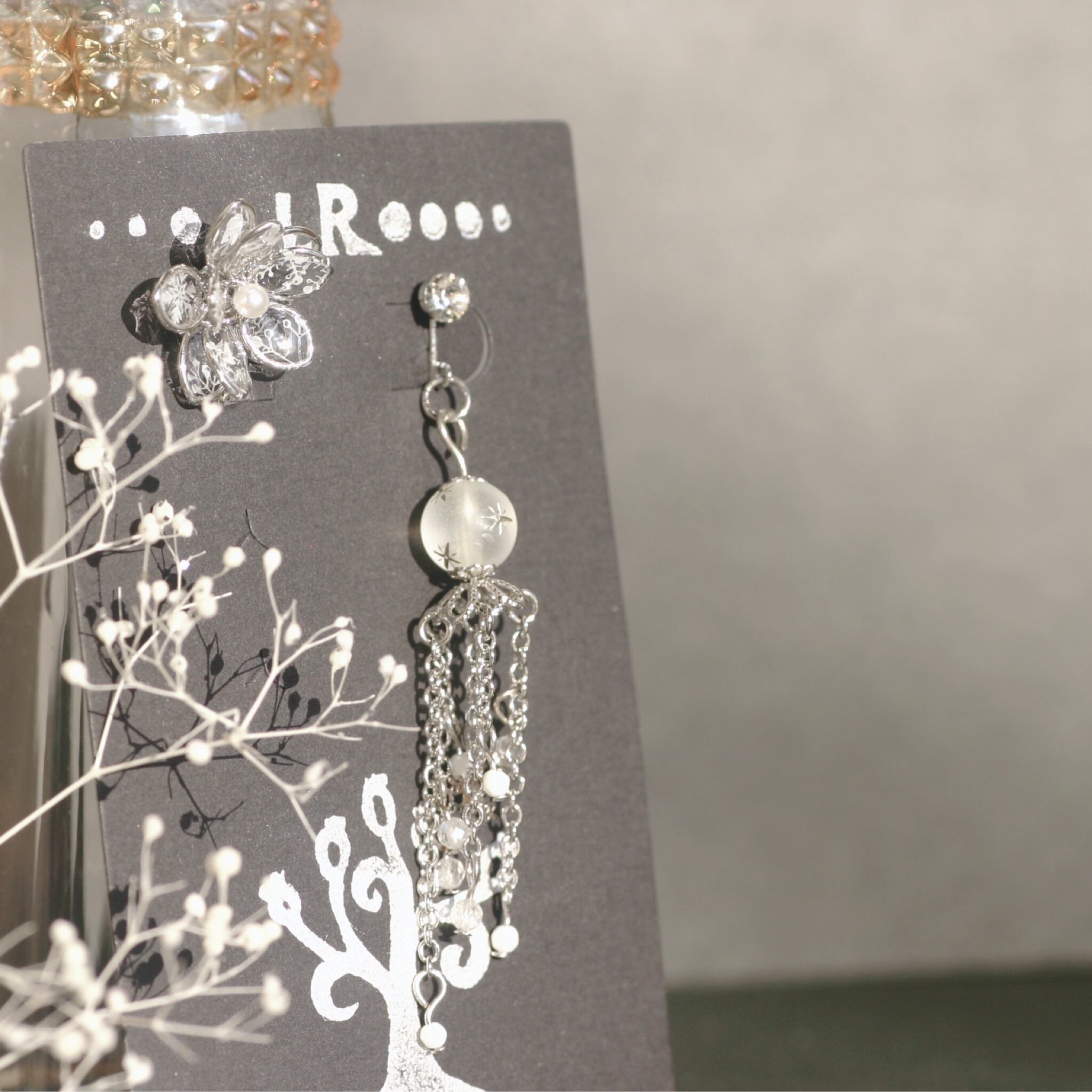 雪霜の花と空から降ってくる雪をイメージしたアシンメトリーのイヤーアクセとなっております。
